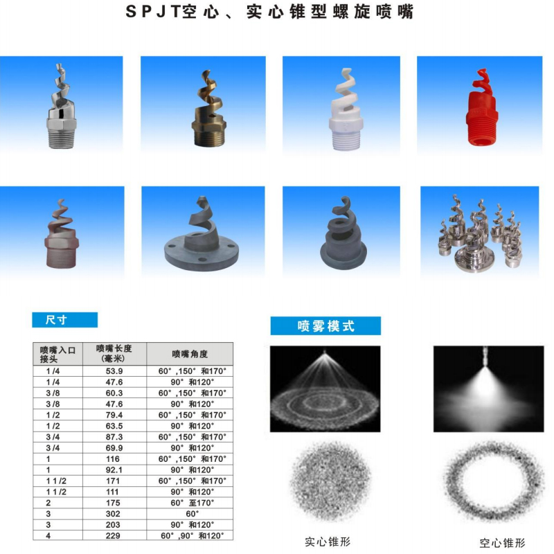 螺旋噴嘴是一種實心錐形或空心錐形噴霧噴嘴,噴流角度范圍可60-170°,在3巴壓力下測試流量范圍為5.5-4140升/分。